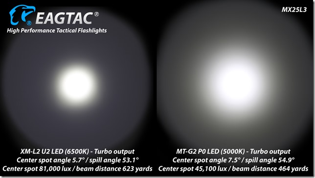 EagleTac hat mit der EagleTac MX25L3 weiteres Modell angekündigt, das technisch nahezu identisch zur EAGTAC SX25L3 ist. Es gibt jedoch eine sichtbare Ausnahme, und das ist der größere Lampenkopf, der von EagleTac auch als Turbo Reflector Head bezeichnet wird. Dank dieses größeren Lampenkopfes bieten beide EagleTac MX25L3-Modelle (MT-G2 P0- und XM-L2-LED) eine deutlich höhere Reichweite als die SX25L3-Pendants. Preislich liegen die MX25L3-Modelle höher, bieten dafür auch aber mehr Leistung hinsichtlich Lux und Reichweite. Des Weiteren hat EAGTAC die MX25L3C angekündigt, wobei das C hier für “compact” steht. Mit der MX25L3C bringt EagleTac ein weiteres interessantes Modell aus der MX25L3-Reihe auf den Markt, die gleich zwei Besonderheiten zu bieten hat. Zum einen ist sie eine der ersten Taschenlampen, die mit 6 x Nichia 219 B11- LEDs ausgestattet sind, und zum anderen handelt es sich um eine verkürzte Variante der MX25L3 (MX25L3C = compact), d.h. sie ist kürzer und kompakter als die MX25L3-Modelle mit Turbo Reflector Head. Die Nichia-LEDs haben einen neutralweißen Farbton mit einer Lichttemperatur von 4500K. Die neuen EagleTac-Modelle sind voraussichtlich ab Mitte November 2013 im MSITC Shop erhältlich. Vorbestellungen sind empfehlenswert, da die erste Lieferung sicher schnell vergriffen sein wird! Ein Review zu den neuen Modellen wird nach Produktverfügbarkeit folgen. |